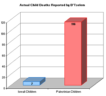 During the study period of May 2004 through October 2004, B’Tselem found a total of 54 Israelis were killed in Israel and the occupied Palestinian territories. Of these, 57 % were soldiers, 29% were adult civilians and 14% were children. In the same period, a total of 502 Palestinians were killed in the occupied Palestinian territories. Of these, 43% were combatants, 34% were adult civilians, and 23% were children (B’Tselem). Overall, during the period over 10 times more Palestinians were killed than Israelis. Palestinian children were killed at a rate 15 times that of Israeli children. Analysis of The Oregonian news articles indicate that 100% of all Israelis deaths were reported and 120% were highlighted in news headlines. (Results over 100% indicate that individual deaths were reported multiple times.) By contrast, 61% of all Palestinian deaths were reported in news articles and 66% in news headlines.