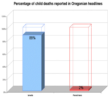 Even more disturbing was the coverage of children’s deaths, with only 28% of Palestinian children’s deaths receiving any coverage by the Oregonian, compared with 100% coverage for Israeli children.