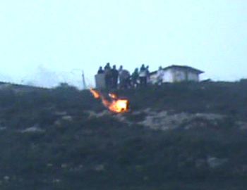Settlers roll burning tires from the Yitzhar settlement to the Palestinian villages Burin and ‘Einabus below. Footage: B’Tselem camera project, 28 Feb. ’11.